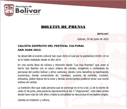 BOLETIN DE PRENSA CALCETA DISFRUTO DEL FESTIVAL CULTURAL SAN JUAN 2022. Se desarrolló el evento cultural San Juan 2022 el cual por la pandemia COVID-19 no se lo había realizado desde el año 2019. En una noche llena de música y diversión desde “Los Dos Puentes” que unen al barrio San Bartolo con el casco urbano de calceta, acogiendo a centenares de personas del cantón bolívar y otros cantones, dando como beneficio la reactivación económica, donde comerciante de: Canelazo, puestos de comidas, cocteles, artesanía, platos típicos de la zona y demás comerciantes pudieron tener una noche exitosa de ventas.