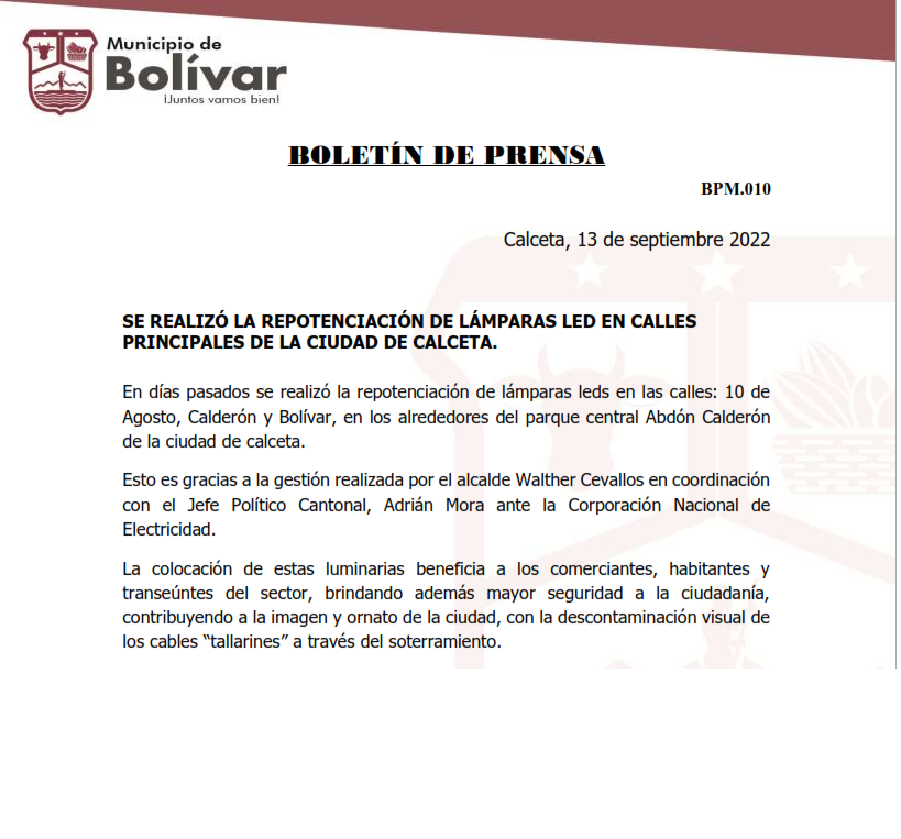 BOLETIN DE PRENSA SE REALIZÓ LA REPOTENCIACIÓN DE LÁMPARAS LED EN CALLES PRINCIPALES DE LA CIUDAD DE CALCETA. En días pasados se realizó la repotenciación de lámparas leds en las calles: 10 de Agosto, Calderón y Bolívar, en los alrededores del parque central Abdón Calderón de la ciudad de calceta. EN UN TRAMO DE LA CALLE SALINAS SE DIO INICIO CON LA CONSTRUCCIÓN DE CARPETA ASFALTICA. Este lunes 12 de septiembre se empezó con la construcción de la carpeta asfáltica de la calle Salinas, a la altura de la vía a Tosagua. Con un total de 690 m2 esta obra beneficia a moradores del sector.