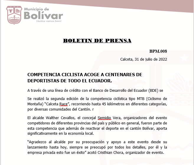 BOLETIN DE PRENSA COMPETENCIACICLISTA ACOGE A CENTENARES DE DEPORTISTAS DE TODO EL ECUADOR. A través de una línea de crédito con el Banco de Desarrollo del Ecuador (BDE) se realizó la segunda edición de la competencia ciclística tipo MTB (Ciclismo de Montaña) “Calceta Race”, recorriendo hasta 45 kilómetros en diferentes categorías, por diversas comunidades del Cantón.