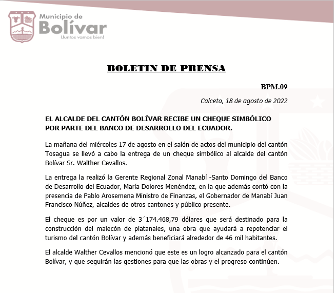 BOLETIN DE PRENSA EL ALCALDE DEL CANTÓN BOLÍVAR RECIBE UN CHEQUE SIMBÓLICO POR PARTE DEL BANCO DE DESARROLLO DEL ECUADOR. La mañana del miércoles 17 de agosto en el salón de actos del municipio del cantón Tosagua se llevó a cabo la entrega de un cheque simbólico al alcalde del cantón Bolívar Sr. Walther Cevallos.