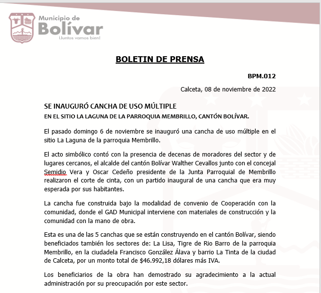 BOLETIN DE PRENSA SE INAUGURÓ CANCHA DE USO MÚLTIPLE EN EL SITIO LA LAGUNA DE LA PARROQUIA MEMBRILLO, CANTÓN BOLÍVAR. El pasado domingo 6 de noviembre se inauguró una cancha de uso múltiple en el sitio La Laguna de la parroquia Membrillo. El acto simbólico contó con la presencia de decenas de moradores del sector y de lugares cercanos, el alcalde del cantón Bolívar Walther Cevallos junto con el concejal Semidio Vera y Oscar Cedeño presidente de la Junta Parroquial de Membrillo realizaron el corte de cinta, con un partido inaugural de una cancha que era muy esperada por sus habitantes.
