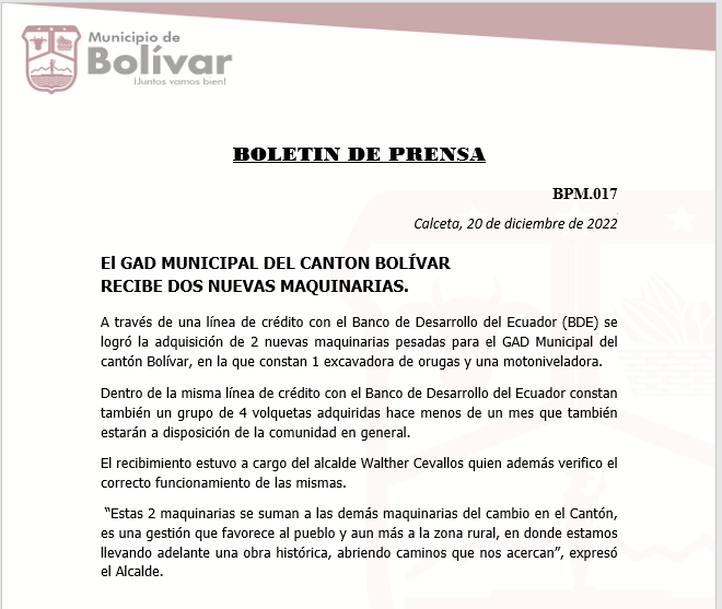 BOLETIN DE PRENSA El GAD MUNICIPAL DEL CANTON BOLÍVAR RECIBE DOS NUEVAS MAQUINARIAS. A través de una línea de crédito con el Banco de Desarrollo del Ecuador (BDE) se logró la adquisición de 2 nuevas maquinarias pesadas para el GAD Municipal del cantón Bolívar, en la que constan 1 excavadora de orugas y una motoniveladora.