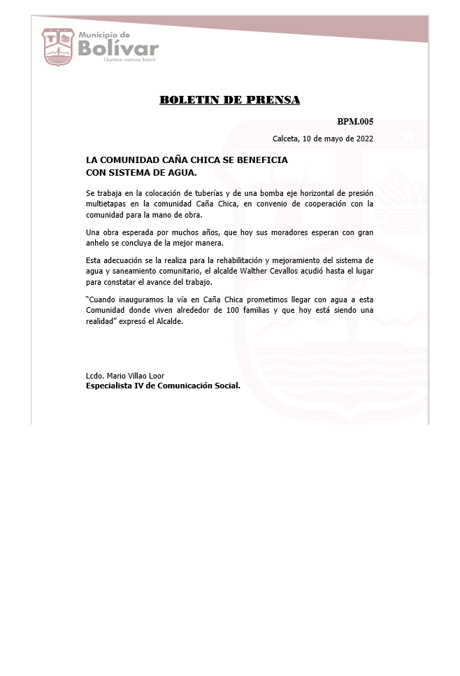 BOLETIN DE PRENSA LA COMUNIDAD CAÑA CHICA SE BENEFICIA CON SISTEMA DE AGUA. Se trabaja en la colocación de tuberías y de una bomba eje horizontal de presión multietapas en la comunidad Caña Chica, en convenio de cooperación con la comunidad para la mano de obra.