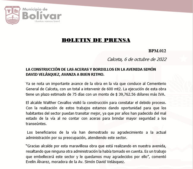 BOLETIN DE PRENSA LA CONSTRUCCIÓN DE LAS ACERAS Y BORDILLOS EN LA AVENIDA SIMÓN DAVID VELÁSQUEZ, AVANZA A BUEN RITMO. Ya se nota un importante avance de la obra en la vía que conduce al Cementerio General de Calceta, con un total a intervenir de 600 mt2. La ejecución de esta obra tiene un plazo estimado de 75 días con un monto de $ 39,762.56 dólares más IVA.